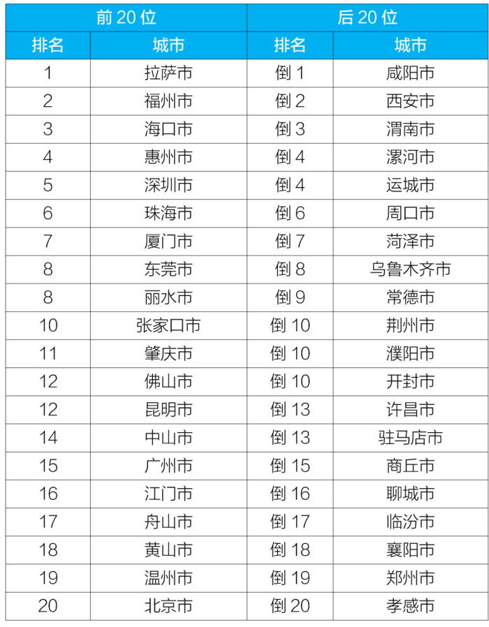 1月,168个重点城市中,拉萨、福州和海口市等城市空气质量相对较好(从第1名至第20名);咸阳、西安和渭南市等城市空气质量相对较差(从倒数第1名至倒数第20名),见附表1。