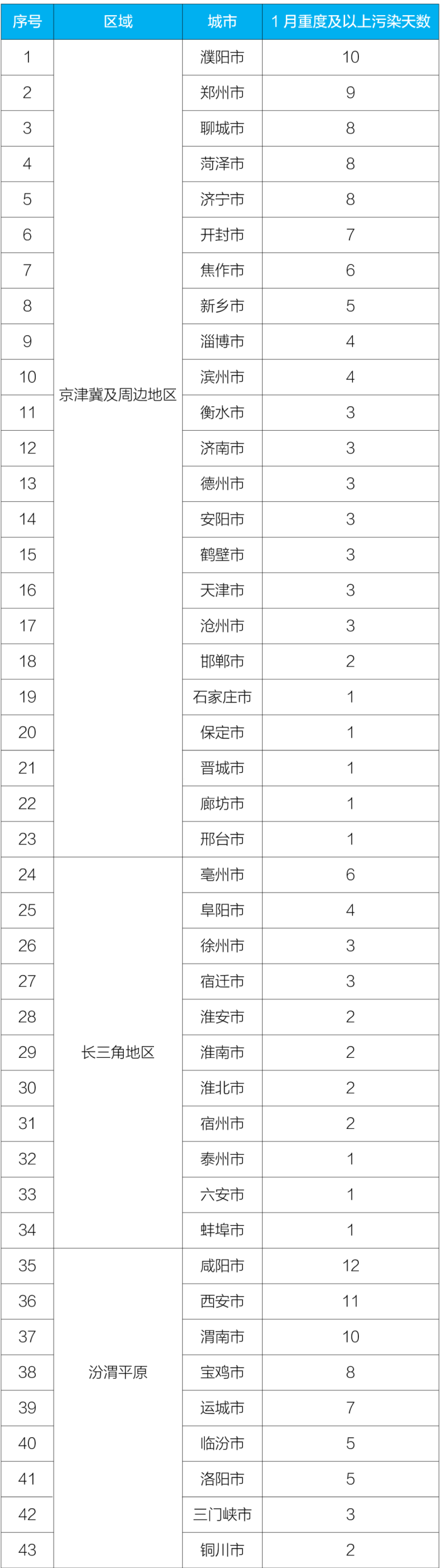 1月重点区域发生重度及以上污染天的城市及具体天数详见附表2。