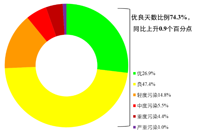 1月,全国339个地级及以上城市平均空气质量优良天数比例为74.3%,同比上升0.9个百分点;平均重度及以上污染天数比例5.4%,同比上升2.3个百分点;PM2.5平均浓度为55微克/立方米,同比下降1.8%;PM10平均浓度为87微克/立方米,同比上升14.5%;O3平均浓度为90微克/立方米,同比上升9.8%;SO2平均浓度为11微克/立方米,同比持平;NO2平均浓度为27微克/立方米,同比下降12.9%;CO平均浓度为1.3毫克/立方米,同比持平。